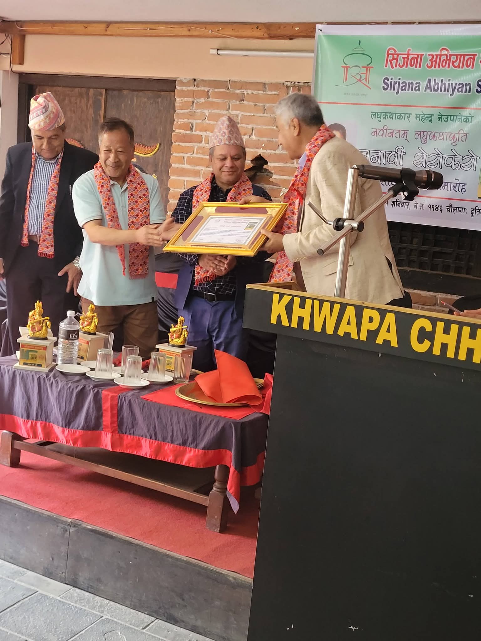 सिर्जना अभियान समाजद्वारा आयोजित कार्यक्रममा सभाध्यक्ष ध्रुव मधिकर्मी,प्रमुख अतिथि डा.पुष्करराज भट्ट,विशिष्ट अतिथिद्वय डा.हरिप्रसाद भण्डारी र लता केसी तथा कृतिकार नेउपानेले संयुक्त रूपमा कृतिको सार्वजनिक गर्नुभएकाे हाे ।