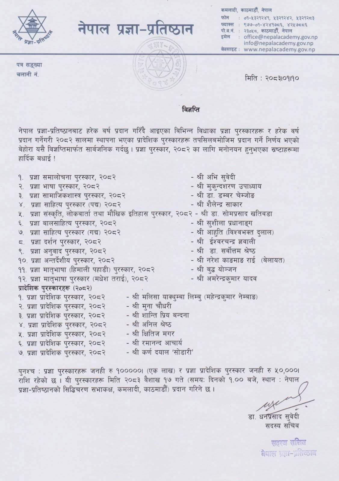झापा १० बैशाख/नेपाल प्रज्ञा-प्रतिष्ठानले विभिन्न विधाका ‘प्रज्ञा पुरस्कार-२०८२’ तथा प्रादेशिक पुरस्कारहरूको घोषणा गरेको छ ।