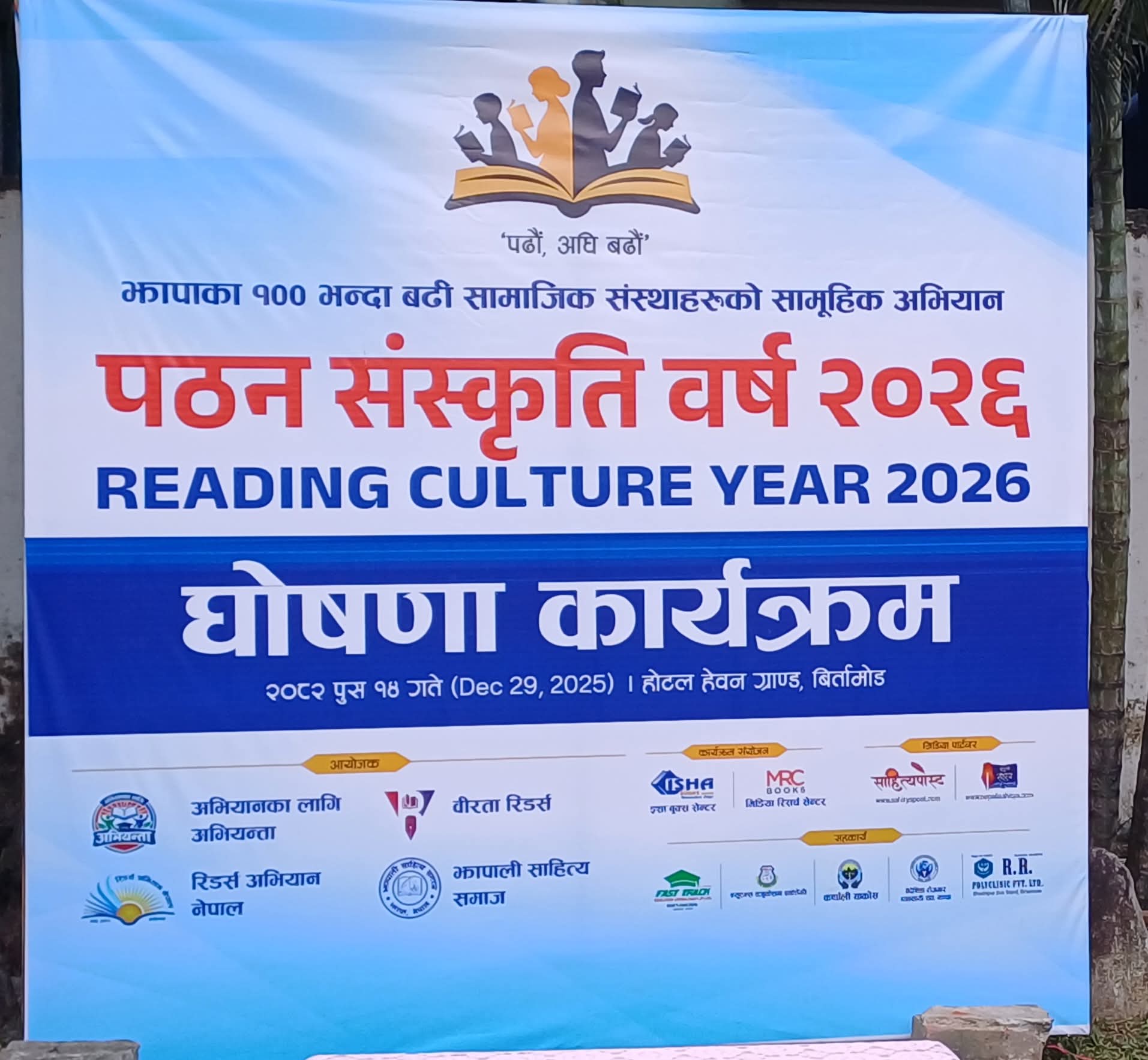 ‘रिडर्स अभियान, नेपाल’,‘अभियानका लागि अभियन्ता’,‘वीरता रिडर्स’, ‘झापाली साहित्य समाज’ को आयोजना तथा ईशा बुक्स सेन्टर बिर्तामोड र मिडिया रिसर्च सेन्टरको संयोजनमा होटल हेवन ग्रान्ड विर्तामोडमा ‘पठन संस्कृति वर्ष–२०२६’को घोषणा गरिएको हो ।