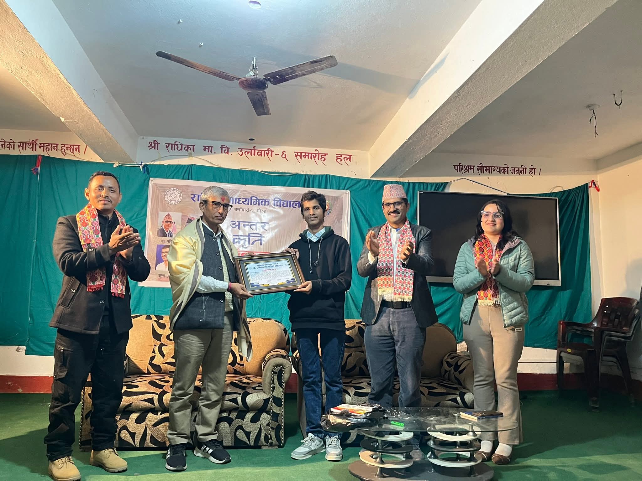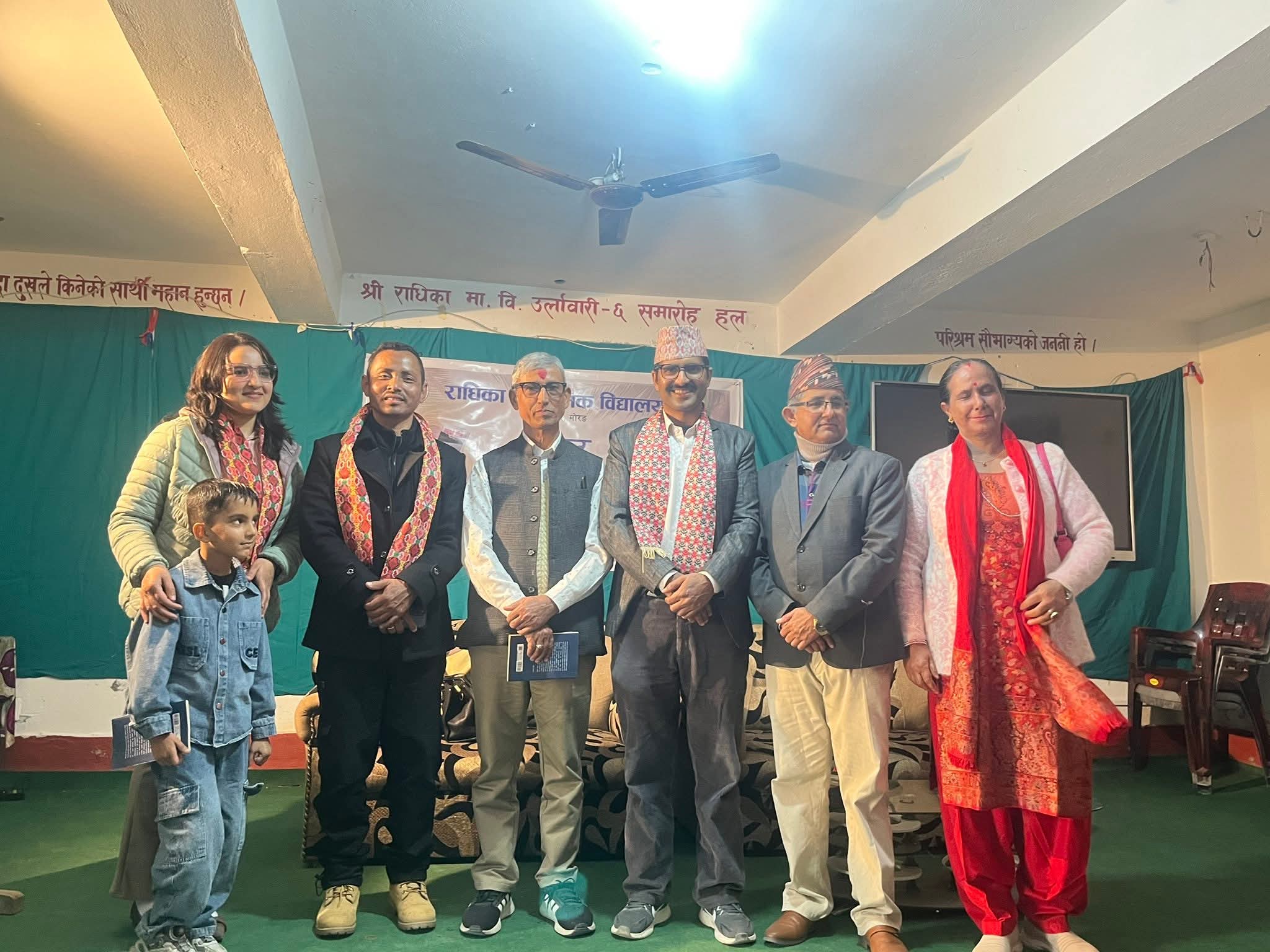 राधिका माध्यमिक विद्यालय उर्लाबारी ६ मा रहेको राधिका साहित्य समाजले यही माघ ५ गते एक भव्य साहित्यिक कार्यक्रमको आयोजना गरेको छ। राधिका साहित्य समाजका संरक्षक, कवि, कथाकार तथा विद्यालयका शिक्षक श्री यज्ञ परिश्रमीको ६१औं जन्मदिन तथा शिक्षण पेशाबाट अनिवार्य अवकाश पाएको दिनको अवसरमा सो कार्यक्रम आयोजना गरिएको हो । उक्त कार्यक्रमको प्रमुख आकर्षण साहित्यिक विधामा बिरलै मात्रै आयोजना हुने "अन्तर कृति संवाद कार्यक्रम" थियो। 'राराको लिला' कविता संग्रहका लेखक कवि यज्ञ परिश्रमी तथा 'पानीको पर्खाल' कविता संग्रहका लेखक, कवि कृष्ण उदासीद्वारा एक अर्काका कृतिको बारेमा अन्तर संवाद गराइएको सो कार्यक्रममा सहजकर्ताको रुपमा कवित्री रिता पोखरेल हुनुहुन्थ्यो । उर्लाबारी, पथरी तथा दमक क्षेत्रका कवि कवित्रीहरूको उपस्थितिमा श्री उदाशी र श्री परिश्रमी बीचको संवाद करिब एक घण्टा ३० मिनेट चलेपछि साहित्य समाज राधिकाले कवि तथा शिक्षक यज्ञ परिश्रमीलाई दोसल्ला तथा सम्मानपत्रद्वारा सम्मानित गरेको थियो।कवि यज्ञ परिश्रमी को जन्मदिन परेको हुँदा विद्यालयका विद्यार्थीहरूले सरप्राइज birthday समेत मनाएका थिए।FB_IMG_1768924806934.jpg257.83 KBविद्यार्थीहरूमा आफ्ना गुरुको जन्मदिनको अवसरमा जति खुसी थियो उहाँबाट टाढा हुनुपरे को कारण उनीहरूमा त्यति नै नैरास्यता थियो। आफ्ना गुरुसँग फोटो खिचाउने क्रममा विद्यार्थीहरूका आँखा रसाएका देखिन्थे भने सोबेला वातावरण स्तब्ध भएको थियो। कार्यक्रममा साहित्य समाज राधिकाका विद्यार्थीहरु युना लिम्बु ,प्रशान्त सापकोटा, सृष्टि भण्डारी, र काजल शाहले कविता वाचन गरेका थिए भने विद्यार्थीहरू किस्मत बास्तोला र प्रशान्त सापकोटा द्वारा लिखित तथा निर्देशित एकाङ्की तथा एकल नाटक "यज्ञ सरको जीवनी"को प्रदर्शन गरिएको थियो, कलाकारमा सोही विद्यालयको कक्षा ९ मा अध्ययनरत विद्यार्थी प्रशान्त निरौला थिए। विद्यालयका विद्यार्थीहरूद्वारा गरिएको सो कार्यक्रमको सर्वत्र प्रशंसा गरिएको छ। उक्त कार्यक्रममा प्रमुख अतिथि वडा नम्बर ६ उर्लाबारीका वडा अध्यक्ष श्री चिन्तामणि पौडेल हुनुहुन्थ्यो भने विशिष्ट अतिथीमा विद्यालय व्यवस्थापन समितिका अध्यक्ष लोलिम पोमु, प्रधानाध्यापक कुमार पोखरेल तथा कवि कथाकार मूर्तिकार मञ्जुल मितेरी हुनुहुन्थ्यो । FB_IMG_1768924798223.jpg296.76 KBकार्यक्रममा शुभकामना मन्तव्य दिनुहुँदै प्रमुख अतिथिले राधिका मावि का विद्यार्थीहरूद्वारा यस्तो कार्यक्रमको आयोजना हुनु अत्यन्तै प्रशंसनीय र सम्मानित कार्यक्रम भएको बताउँदै शिक्षक यज्ञ परिश्रमी को अवकाश प्राप्त जीवनसुखद रहोस् भन्ने कामना गर्नुभयो। विद्यालयका प्रधानाध्यापक कुमार पोखरेलले राधिका माध्यमिक विद्या