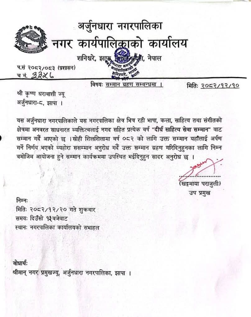 झापा ११ चैत्र /वरिष्ठ साहित्यकार कृष्ण धरावासीलाई अर्जुनधारा नगरपालिकले`दीर्घ साहित्य सेवा सम्मान´प्रदान गर्ने भएको छ।